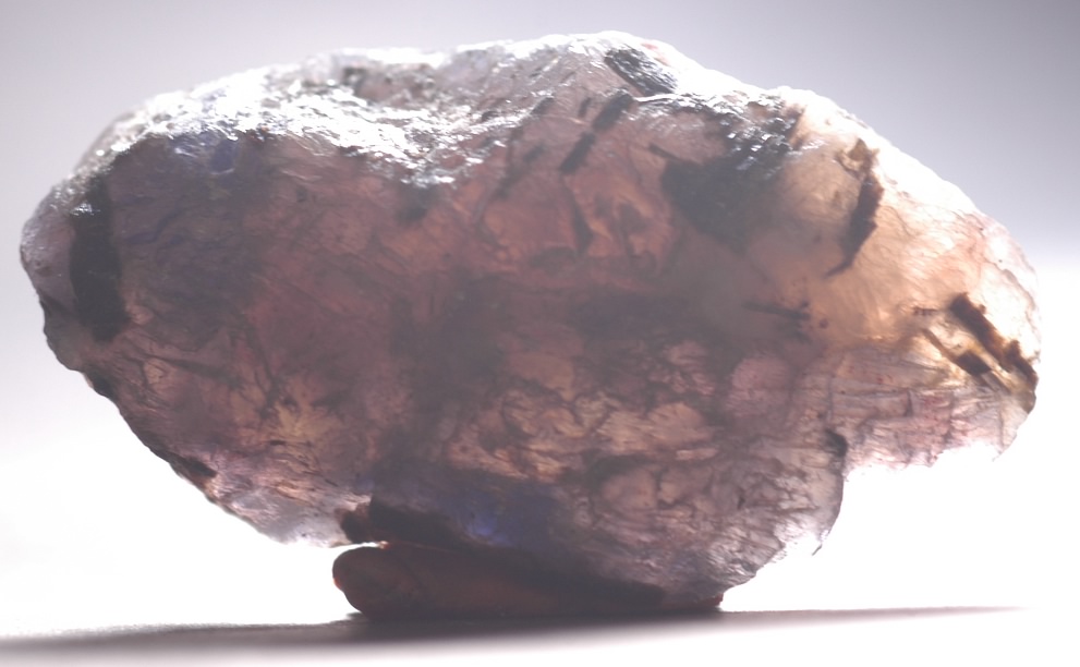 写真3 菫青石。縦2.5㎝、横4㎝、厚さ1㎝。右は光を通して見たもの。